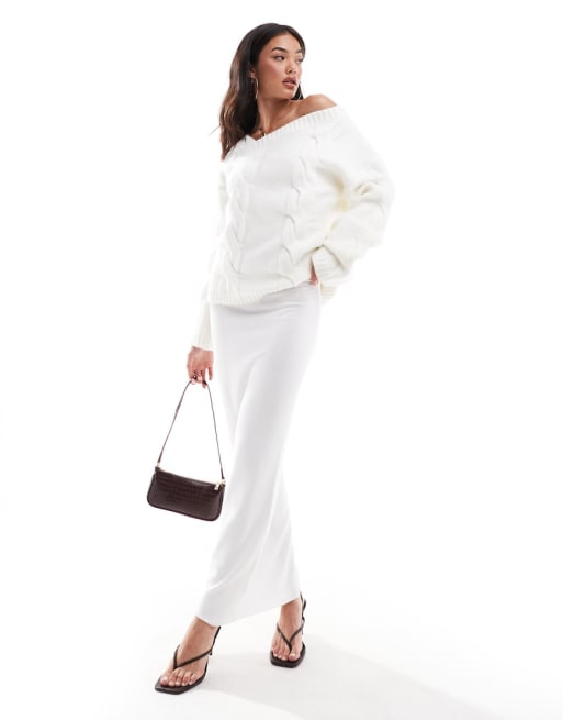 SNDYS premium asymmetric v neck knit jumper and maxi skirt set in cream