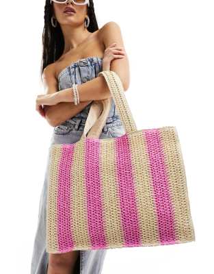 South Beach striped straw woven shoulder tote bag in pink and natural