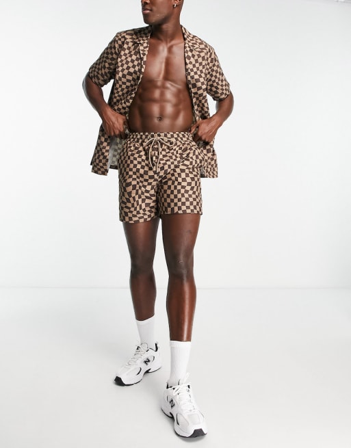 South Beach swim shorts and shirt set in brown warped check print