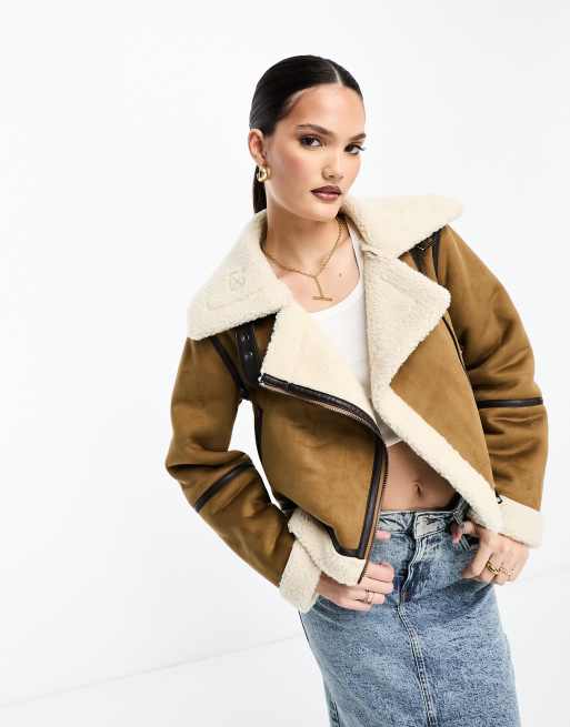 Stradivarius cropped aviator jacket with contrast piping in tan