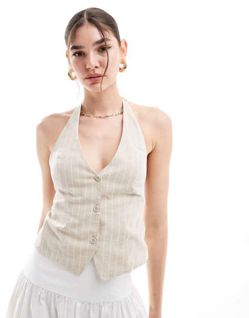 Stradivarius open back halterneck pinstripe waistcoat in beige