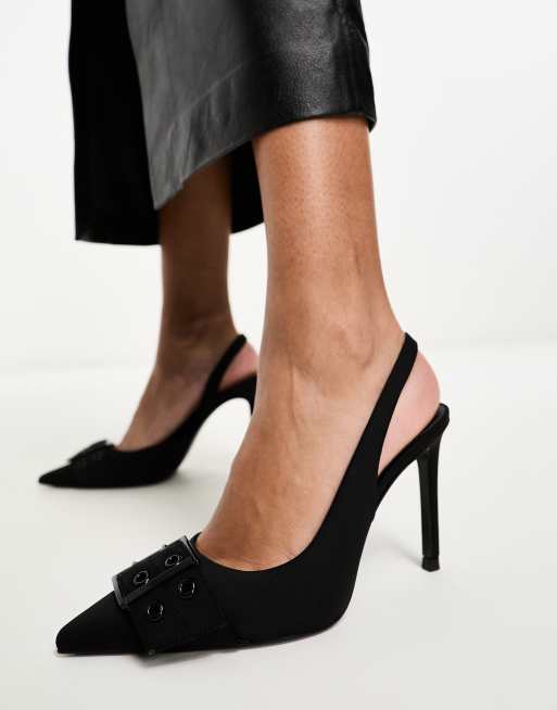 Stradivarius pointed toe buckle detail slingblack kitten heels in black