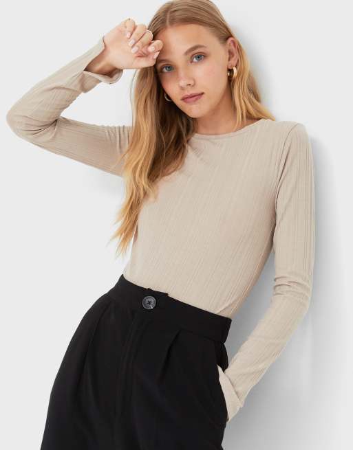 Stradivarius ribbed long sleeve top with split sleeve detail in beige