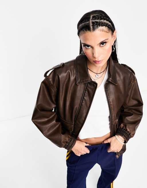 Stradivarius STR faux leather oversized biker jacket in washed brown