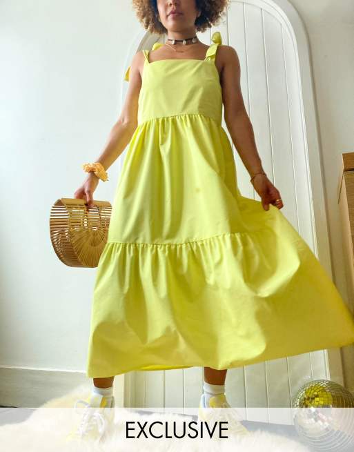 Stradivarius tiered poplin midi dress with bunny ties in yellow