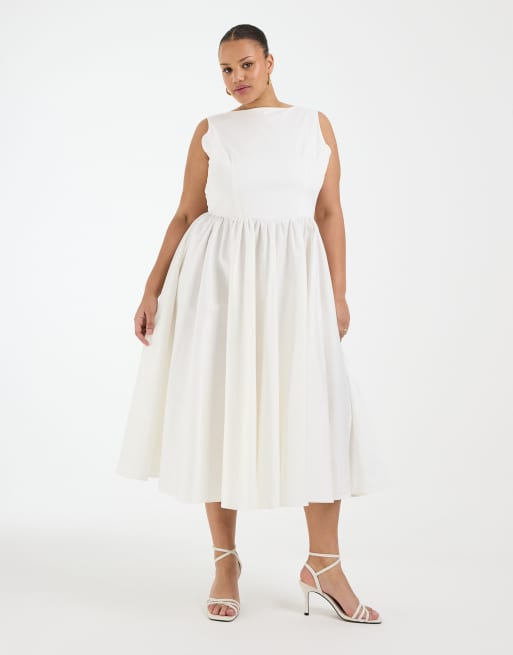 TFNC Plus Bridal boat neck bow back cotton midi dress in ivory