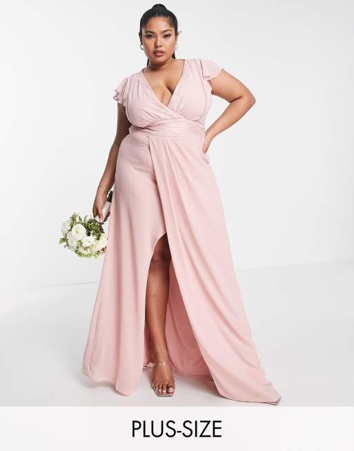 TFNC Plus Bridesmaid flutter sleeve v neck dress in dusty pink