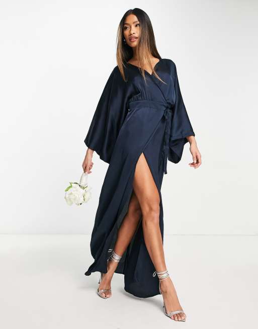 TFNC Bridesmaid kimono sleeve satin wrap maxi dress in navy
