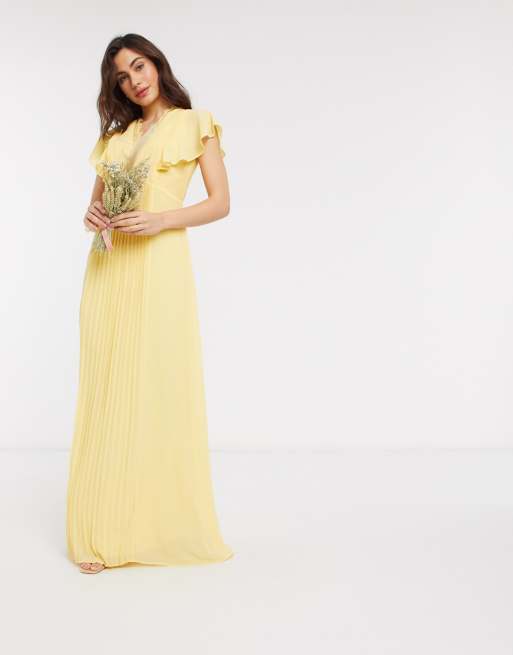 TFNC bridesmaid lace detail maxi dress with flutter sleeve in lemon