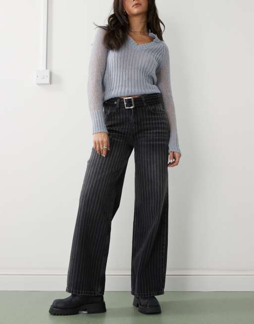 The Ragged Priest laser pinstripe release jeans with belt in charcoal stripe