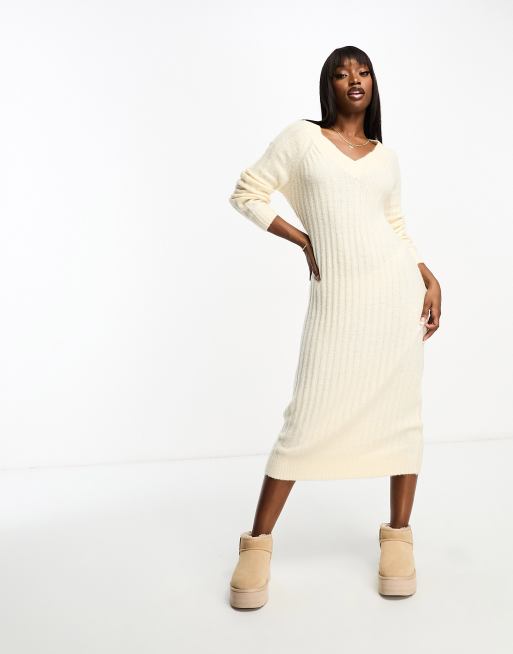 Threadbare Bella v neck ribbed midi jumper dress in off white