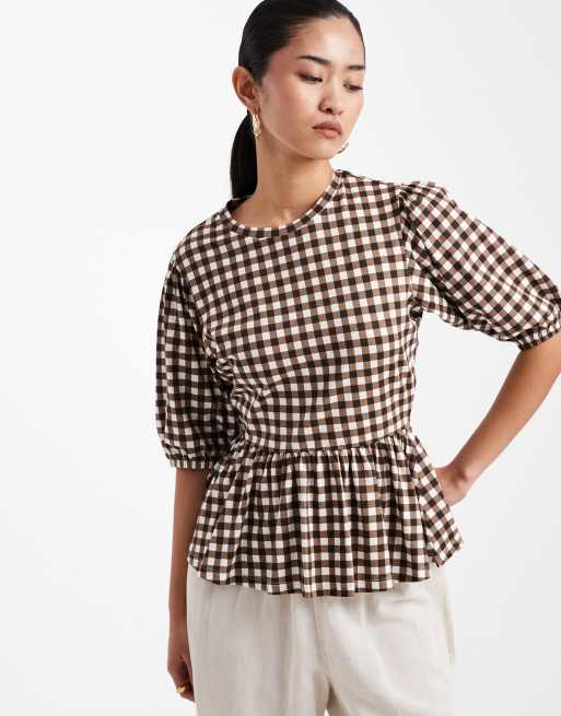 Threadbare jersey puff sleeve peplum top in brown gingham print