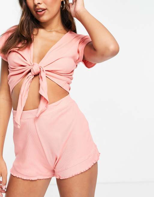 Threadbare tie front crop top and frilly shorts pyjama set in coral