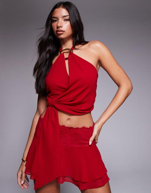 Tiger Mist Indigo chiffon halterneck drape tie side multiway top in red (Part of a set)