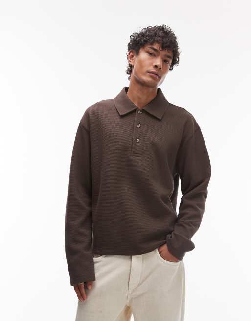 Topman boxy fit waffle polo sweat in brown