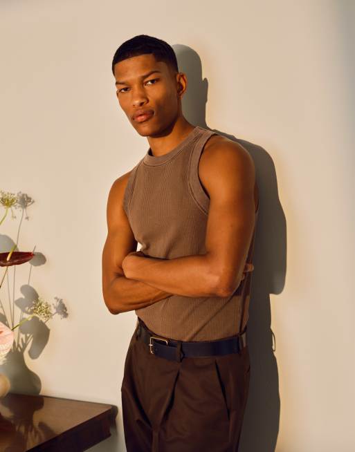 Topman high neck stripe rib singlet in washed brown