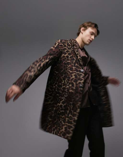 Topman leopard print longline overcoat with wool in brown