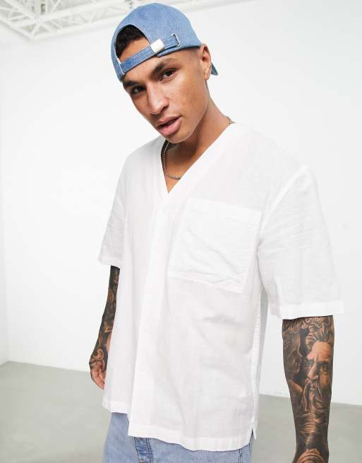 Topman linen collarless shirt in white