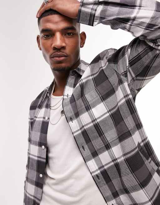 Topman long sleeve regular flannel check shirt with drawstring hem in black and white