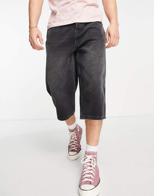 Topman longline denim shorts in washed black