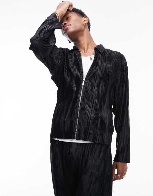 Topman oversized fit long sleeve zip through polo with jacquard plisse in black