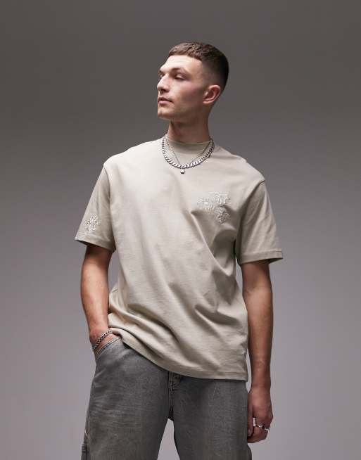 Topman oversized fit t-shirt with floral placement embroidery in stone