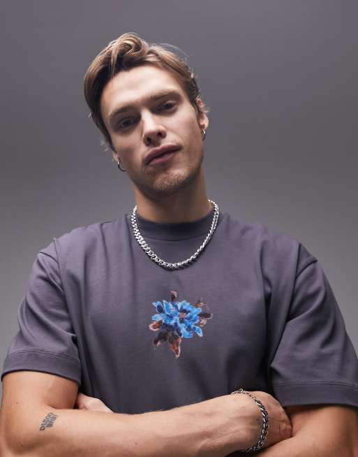 Topman premium oversized fit t-shirt with painted floral in charcoal