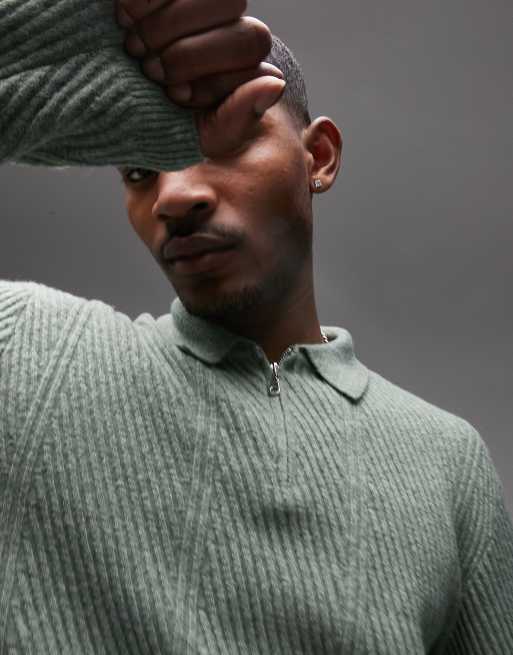 Topman smart knitted chevron 1/4 zip polo in sage