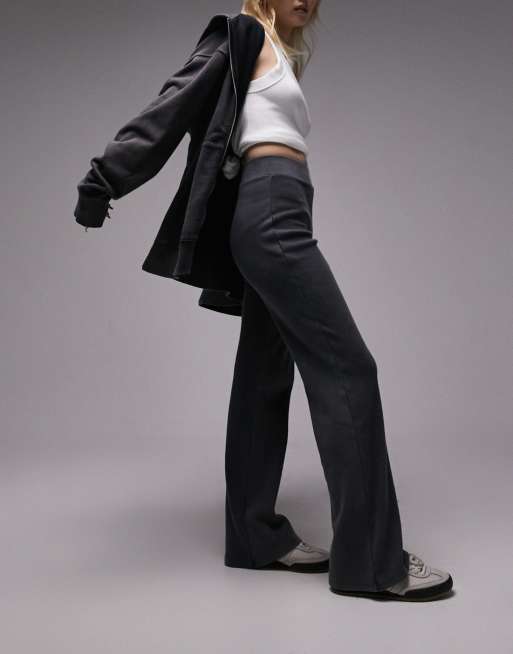 Topshop Petite acid wash rib straight leg pants in washed charcoal