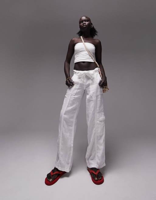 Topshop Petite linen tie waist mid rise straight leg pants in white