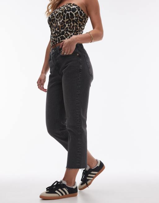 Topshop Petite mid rise straight cropped jeans with raw hems in washed black