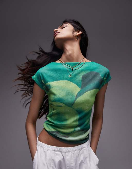 Topshop apple print mesh cap sleeve top in green