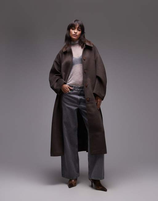 Topshop belted longline formal coat in brown