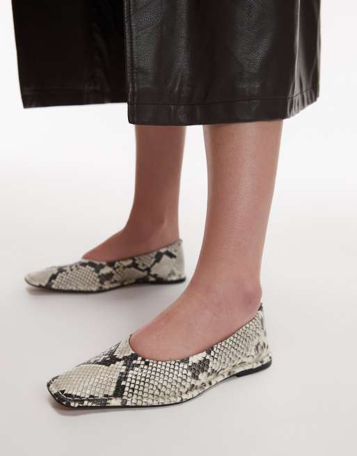 Topshop Casey premium leather square toe ballet flats with ruched detail in snake print