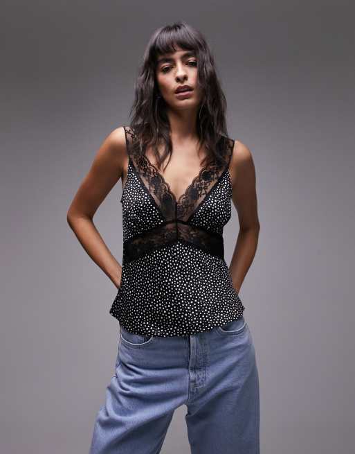 Topshop contrast lace trim cami top in polka dot