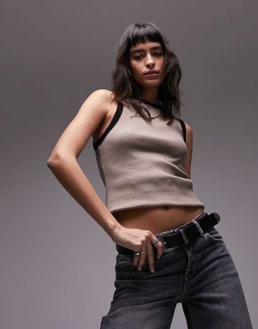 Topshop contrast rib slim singlet in khaki