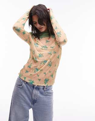Topshop crinkle ditsy placement high neck long sleeve top in peach