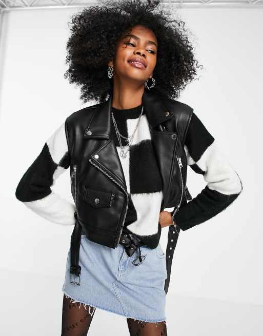 Topshop cropped sleeveless biker jacket in black