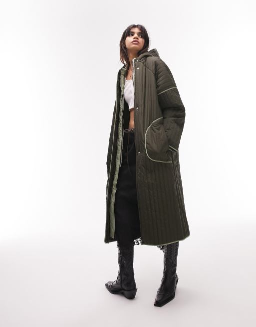 Topshop double placket longline quilted parka with hood in khaki