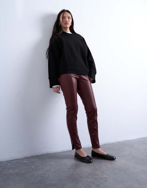 Topshop faux-leather drain pipe skinny pants in burgundy