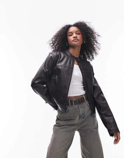 Topshop faux leather slim fit washed jacket in dark brown