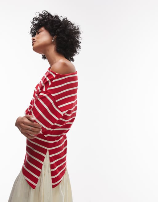 Topshop jersey asymmetrical short sleeve top in red stripe