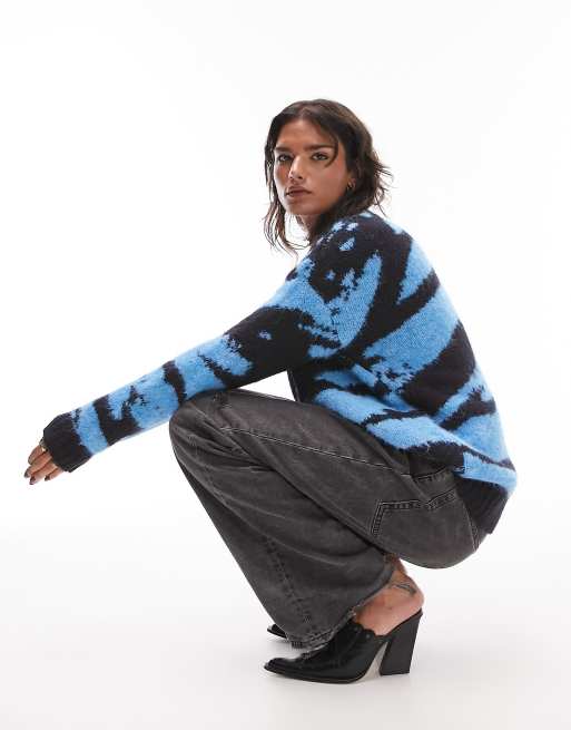 Topshop knitted abstract print oversized jumper in blue