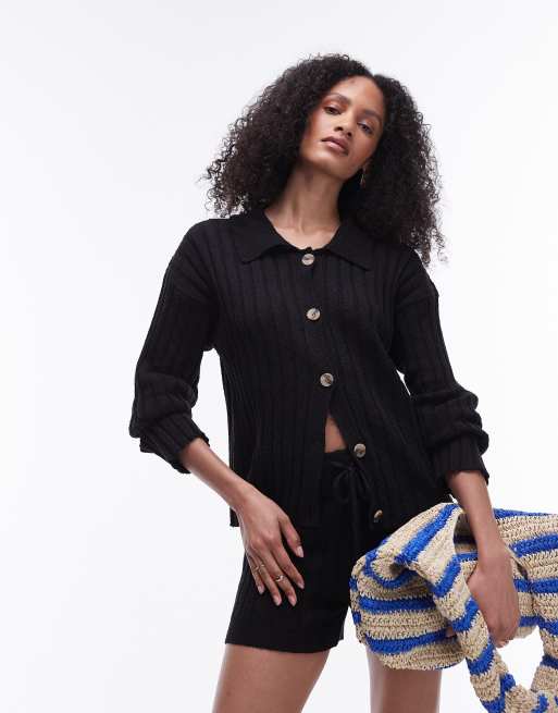Topshop knitted button through ribbed shirt in black (part of a set)
