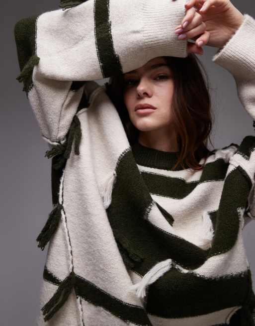Topshop knitted tassel patchwork oversized jumper in green and ecru