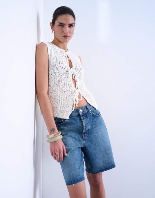 Topshop knitted textured tie front waistcoat in ivory