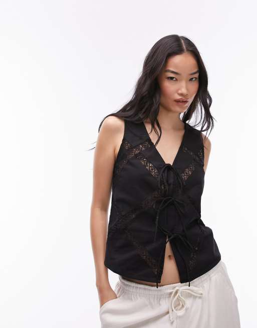 Topshop lace trim insert tie up waistcoat in black