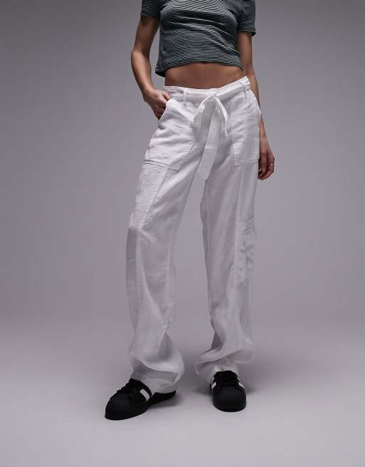 Topshop linen tie waist mid rise straight leg pants in white