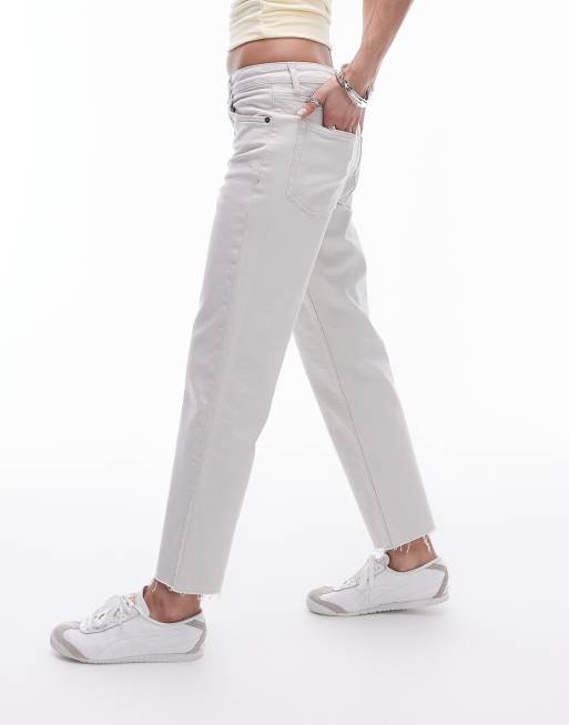 Topshop mid rise straight cropped jeans with raw hems in off white