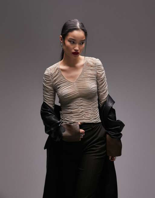 Topshop ruched long sleeve top in mushroom
